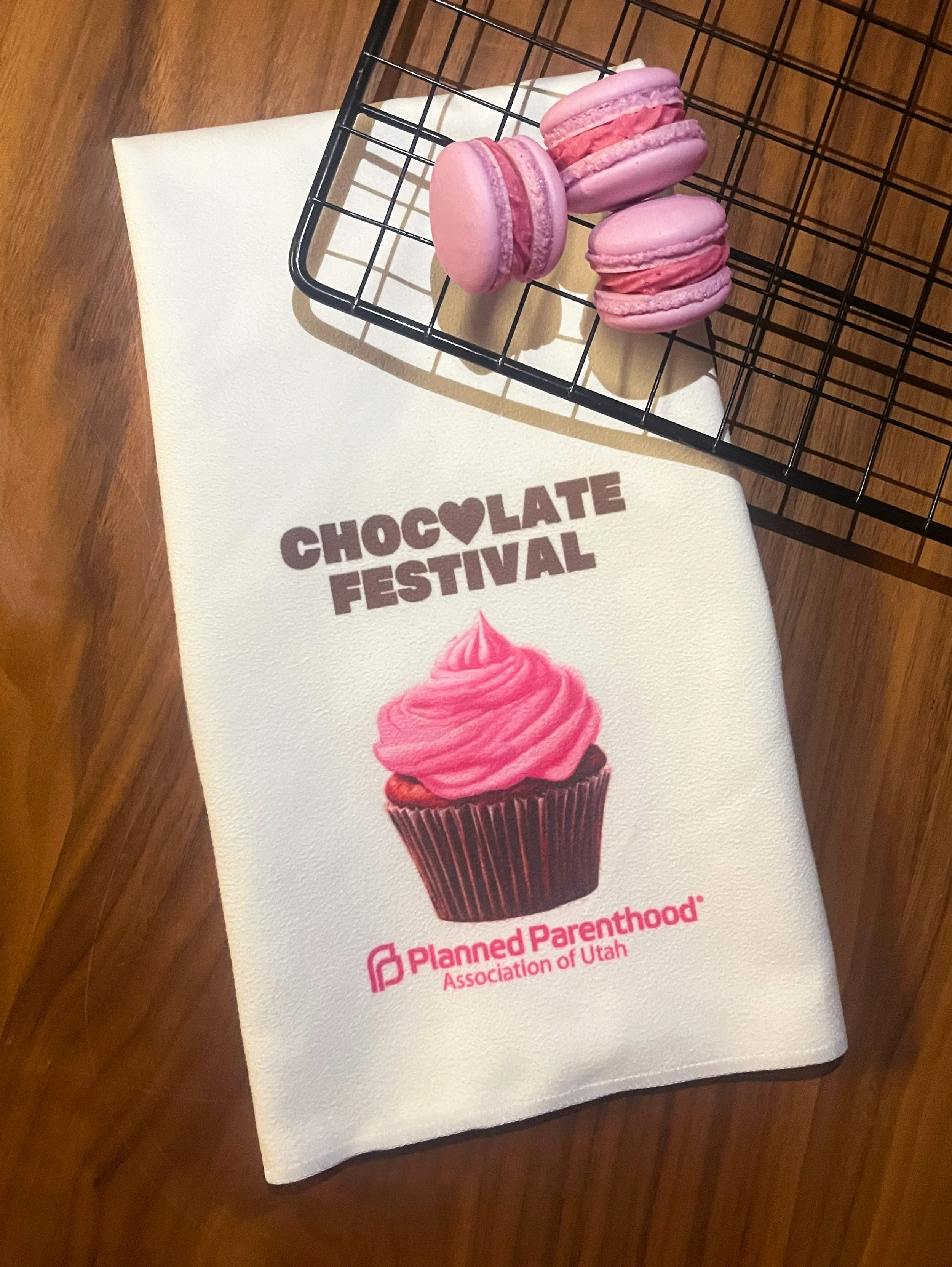 This eco-friendly, sublimated tea towel is made from 100% recycled PET material, promoting sustainability and reducing waste. Perfect for those prioritizing a cleaner, greener environment. Featuring our newest Chocolate Festival cupcake logo! (Dimensions: 16.25” x 26”)